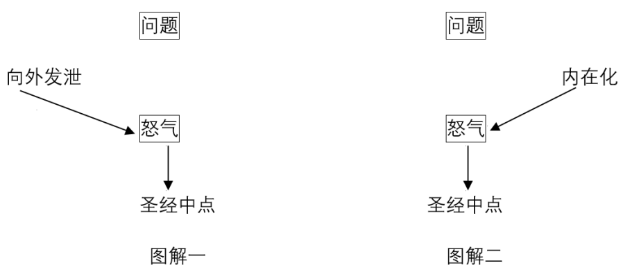 现在让我们了解一下神所责备的两种发怒其错误何在,以及如何才是合乎圣经的怒气?首先请注意,前述的两种发泄怒气的方法都不能解决任何问题,反而制造新的和更难的问题。怒气是一种强大的激发力量,目的是驱使人去伤害一些事物。但是,问题是神并没有给我们权利去伤害他人或自己的身体。发怒目的是要伤害别人(或在附近顺手拿到有象徵性东西加以毁坏)。把怒气内在化压抑在心头(虽非故意,但习惯如此的话)乃是要伤害自己。对人对事爆发怒气,就是「发脾气」,的确是可以把「气」发泄出来,但这样并没有真正解决发怒生气的基本问题。反而因为发泄这些气力而不控制,结果成为蓄意伤害别人,这便构成更大的伤害。至于把怒气压抑在心中,就是把「气」对自己身体发 。这些能力本来是用来激发鼓励人以适当的方法来解决生气发怒的问题的,但却误用来针对自己的身体,结果引致精神紧张、肠胃炎、胃癌或其他的痛苦。
